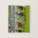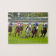 Ein volles Feld von neun Pferden, die für Zuhause an der Spitze der Ausdehnung auf dem Rasen Parx an Laufen und an Kasino sich drehen. Laufens des beststen Momentes, als die Thoroughbreds zu die Ausdehnung für das abschließende Bestreben nach der Endlinie machen. Die Weise, das weiße Graue "und die genauen Führungen schnell führen die Gebühr mit jr. Jockey Jose Ortiz in den Eisen. Grünes Gras, blaue Himmel und weiße Thoroughbreds bei historischem Parx für die Ausführung die Alphabet-Suppenstangen.