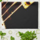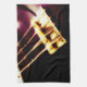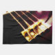 Das Original, abstrakte Foto von ZoeSPEAK auf diesem Küchentuch konzentriert sich auf die Basis einer elektrischen Bassgitarre, der Teil, wo die Saiten beginnen und bis zum Hals steigen. Die Foto-Färbung in der Nähe erfolgt in kräftigen, warmen Braun mit goldenem Licht auf der Metallplatte, Fäden, Schrauben und Federn.