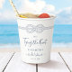 Diese modernen nautischen Brautparty-Papiertassen verfügen über einen Seilknoten oben, der in einem angesagten Schriftsatz in einem klassisch-weiß-marineblauen Farbschema mit der entsprechenden nautischen Phrase "The Knot" übersetzt wird.