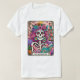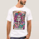 Lebhaftes, farbenfrohes Design mit einer lustigen Tarot-Karte mit einem Skelett. Das Skelett hat wild rosa Haare mit Blume darin, ein Zuckerschädelgesicht und hält ein offenes Buch. Der farbige Text lautet: "Der Bücherwurm". Dieses Design ist auf einer Vielzahl von Produkten erhältlich.