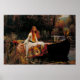 Das ist "Die Lady von Shalott", gemalt von John William Waterhouse im Jahr 1888. Es wurde durch den Viktorianischen gleichnamigen Balladen inspiriert, der 1842 von Alfred, Lord Tennyson, geschrieben wurde. Das Gedicht ist Set in der mittelalterlichen Zeit, während der Regierung von König Artus. Die Insel Shalott liegt in einem Fluss in der Nähe von Camelot. Die Dame von Shalott, ein schönes junges Mädchen, lebt allein in einem Schloss auf der Insel. Sie wird von einem Fluch in das Schloss eingesperrt, der ihr verbietet, direkt in Camelot die Außenwelt zu sehen. Stattdessen muss sie die Welt nur in einem Spiegel betrachten, und sie webt, was sie sieht, in einen Wandteppich. Sie lebt in Verzweiflung, die danach trachtet, Teil der Welt von Camelot zu sein und ein normales Leben zu führen. Ihre Verzweiflung verschlimmert sich eines Tages, wenn sie das Spiegelbild von Sir Lancelot sieht und in Liebe mit ihm fällt. Obwohl sie weiß, dass dies den Fluch zur Erfüllung bringen wird, schaut sie direkt aus dem Fenster auf ihn. Sie wollte verzweifelt, mit ihm zusammen zu sein und Teil der Welt zu sein, verlasse das Schloss, rasiert die Ufer des Flusses hinab, betritt ein Boot und Sets, die es flussabwärts in Richtung Camelot abbiegt. Aber das Wetter ist schrecklich kalt und stürmisch, und die wunderschöne Lady von Shalott erliegt der Kälte und stirbt tragisch, bevor sie Camelot erreicht. Sie sehen sie hier in ihrem Boot, kurz bevor sie es in Richtung Camelot Set, wissend, dass sie die.