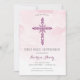 Diese hübsche und trendige Einladung der First Holy Communion besticht durch einen rosa Aquarellhintergrund mit einem illustrierten lila Kreuz und den Worten "Erste heilige Kommunion" in einem stilvollen Schriftart. Der Hintergrund kann entfernt und an eine Farbe Ihrer Wahl angepasst werden. Der Text kann auch für den besonderen religiösen Anlass Ihrer Tochter personalisiert sein.