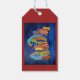 Ein buntes, lustiges, eigenartiges Bild mit Blues, Rot-, Gelb- und Orangetönen, in dem verbogene Gebäude auf dem Wasser dargestellt werden.