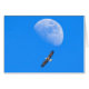 Ein kleiner Glatzadler steigt im Himmel auf, hinter dem sich ein dreiviertel Mond befindet.