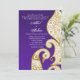 Eine dramatische Einladung eines gold-weißen Mehndi-Schwan-Designs vor einem reichen Pflaumenrahmen.