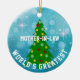 Weihnachtsschmuck für Ihre Mutter im Gesetz oder irgendjemand. Passen Sie das Design an, um jedem etwas zu sagen. Blauer Hintergrund mit Schnee und Glitzern und ein Weihnachtsbaum mit roten Herzen, goldenen Sternen und Schneeflocken. Gib einen an jeden auf deiner Weihnachtsliste,