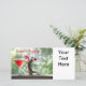 Ein Eichhörnchen, das eine Weihnachtsmannmütze trägt, schluckt einen Cocktail aus einem Strohhalm mit "Die Grüße der Saison", geschrieben in obigem Drehbuch. Ein originelles Foto für Eichhörnchenliebhaber da draußen!