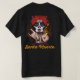 Eine eindrucksvolle Abbildung von Santa Muerte, die mit einem traditionellen Zuckerschädel-Gesicht, gekrönt mit rote Rosen und mit einem goldenen Revolver dargestellt ist. Ihre lang fließenden Haare umrahmen ihr Gesicht, während ihre tätowierten Hände symbolische Gesten zeigen, Schönheit, Mystik und Power vermischen