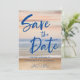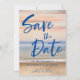 Eine wunderschöne Strandszene mit goldfarbenem handgeschriebenem Schriftart "Save the Date". Dieses Design verfügt über einen großen kalligraphischen Schriftart, den Sie ändern können. Sie können auch alle Details und Farben auf diesem Save the Date Design anpassen.