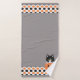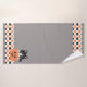 Dieses hübsche Badetuch-Set mit einer schwarz-weißen Katze liegt in einem geschnitzten Kürbis. Unter dem Text befindet sich ein weißes Band mit einem schwarz-orangefarbenen Kürbismuster.