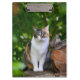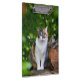 Eine Katze sitzt im grünen Garten neben einem Baumstamm und blickt nach vorn - zwei verschiedene Seiten