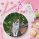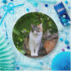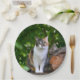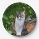 Eine Katze sitzt im grünen Garten neben einem Baumstamm und blickt nach vorn