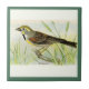 Keramik Tile mit einem Vintagen zeichn eines Dickcissel-Vogels mit gelben und schwarzen Federn. Dieser farbige zeichn der Dickcissel stammt aus der altmodischen Werbekartenreihe Arm and Hammer Baking Soda.