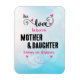 Die Liebe zwischen Mutter und Tochter kennt keine Distanz in gemischter, schwarz und hellrosa Schrift und Großbuchstaben mit Schriftrollen und Herzenschmuck. Set auf blass blauem Bukett mit rosa Farbtönen.