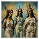 A.I. erstellte surreal Druck von drei alten griechischen Göttinnen, die als Moirai oder die 3 Schwestern des Schicksals bekannt sind. Sie waren die Personifizierung des Schicksals - : Clotho (der Spinner), Lachesis (der Allotter) und Atropos (das Unvermeidliche, eine Metapher für den Tod), gekleidet in fließenden Roben und verzierten Kronen.