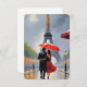 Mit diesem atemberaubenden Gemälde, das das Wesen der Liebe inmitten des zeitlosen Charmes der Stadt vereint, gelangen Sie in die bezaubernden Straßen von Paris. Ein elegant gekleidetes Paar teilt sich einen zarten Moment unter einem lebendigen roten Schirm und schafft einen auffallenden Kontrast zu den regengetränkten Kopfsteinen. Der Eiffelturm, ein ewiges Symbol der Romantik, erhebt sich majestätisch im mistigen Hintergrund, seine Silhouette ist ein Versprechen von Träumen und Abenteuern. Gib ein großes Dankeschön mit dieser wunderschönen Designkarte.