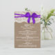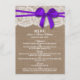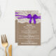 Die rustikale lila Bogen-Hochzeitskollektion ist ein atemberaubendes Design mit einem hübschen rustikalen Burlap-Effekt-Hintergrund mit einem romantischen Vintagen, weißen Spitzeneffekt und einem atemberaubenden lila Bogen. Diese Menüs können für Ihren besondere Anlass personalisiert sein und würden die perfekte Vorlage für Hochzeitsmenüs, Brautparty-Menüs, Partnermenüs, Geburtstagsmenüs und vieles mehr machen. *Bitte beachten Sie, dass Zazzle nur gedruckte Produkte verkauft, sodass dieses Produkt keine echten Bruch-, Spitzen- oder Bänder-/Bogen-Materialien aufweist.