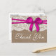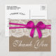 Die rustikale rosa Bogen-Kollektion ist ein atemberaubendes Design mit einem hübschen rustikalen Burlap-Effekt-Hintergrund mit einem romantischen Vintagen Spitzeneffekt-Trim, der mit einem atemberaubenden dunkelrosa Band mit Bogen fertig gestellt wurde. Diese Postkarten können für Ihren besondere Anlass personalisiert sein und würden die perfekte Dankeschön-Karte für jede Hochzeit, Brautparty, Verlobung, Geburtstagsparty und vieles mehr machen. *Bitte beachten Sie, dass Zazzle nur bedruckte Postkarten verkauft, sodass diese Dankeschön Postkarten keine echten Bretter-, Spitzen- oder Bandmaterialien haben.