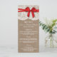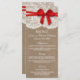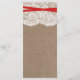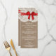 Die rustikale Hochzeitskollektion mit rotem Bogen ist ein atemberaubendes Design mit einem hübschen rustikalen Burlap-Effekt-Hintergrund mit einem romantischen Vintagen Spitzeneffekt und einem atemberaubenden Rot-Bogen. Diese Menüs können für Ihren besondere Anlass personalisiert sein und würden die perfekte Vorlage für Hochzeitsmenüs, Brautparty-Menüs, Partnermenüs, Geburtstagsmenüs und vieles mehr machen. *Bitte beachten Sie, dass Zazzle nur gedruckte Produkte verkauft, sodass dieses Produkt keine echten Bruch-, Spitzen- oder Bänder-/Bogen-Materialien aufweist.