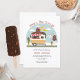 Eiscreme-neutrale Babydusche mit Illustration eines Campers mit Schokoladeneiskegel auf der Oberseite und Babykleidung, die von der Wäscheleine hängt, die an gigantischen Eisdielen mit Kakteen in Kakteen-Behältern befestigt ist.