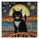 A.I.made print of a star, moonlit night sky zeigt eine schwarze Katze im Vordergrund, Set gegen eine Landschaft von malerischen Dorfhäusern und farbenfrohen Gebäude.