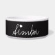 Kundengebundene Namensschüsseln für Haustiere wird in einer "weiße Kreide auf schwarzem Brett" Art hergestellt. Es gibt ein weißes Herz, das über "ich" gesetzt wird. Wenn der Ihr Name des Haustieres nicht "mich" in der Rechtschreibung hat, kann dieses Herzbild auf die Tasse anderswo entfernt werden oder einfach vergrößert werden und gesetzt werden.