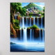Eine schöne Stadt in der Nähe eines wunderschönen klaren Wasserfalls mit einem Berg im Hintergrund. Das ist eine künstlerische KI.