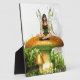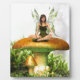 Eine unschuldige Fee in einem Laubgrün-Outfit, das von den Blätter des Waldes gezeichnet wurde, sitzt in der Betrachtung auf einem großen Hocker. In diesem von Jayne Wilson entworfenen fantasievollen digitalen Kunstwerk