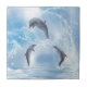 Ein Delphin springt aus dem Waterhole in den Ozean. Dieser Delphin wird von zwei weiteren Delphinen erwartet. Klicken Sie auf Anpassen, um das Geschenkprodukt personalisiert zu machen!