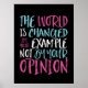 Die Welt wird durch Ihr Beispiel verändert, nicht durch Ihre Meinung. Inspiration und motivierend Zitat-Design für diejenigen, die für Gleichheit eintreten, Liebe statt Hass wählen und auf eine bessere Welt hoffen. Inspirier positiver Sprichwort-Waren für Rassismus und Antischikanismus. Die Menschen aufblähen und inspiriert werden, positiv zu sein, freundlich, mutig zu sein und den Mut zu haben, sich zu äußern. Wähle immer Güte, hör auf zu hassen und höre auf, rassistisch zu sein. Retro und bedrückte Typografie Design zu feiern Leben, Menschlichkeit und Ehre unserer Unterschiede.