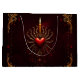 Die wunderschöne Kunst der gotischen Eleganz. Romantisches Design mit einem zentralen Motiv aus brennendem Kerzenlicht in einem herzförmigen Rahmen. Die Kerze ist umgeben von goldenen, spinnenartigen Zweigen, das Herz ist mit roten Juwelen geschmückt. Der Hintergrund ist eine tiefe Krönung, und das Bild wird durch verzierte Goldscrollarbeit mit tropfenden roten Akzenten gerahmt. Die allgemeine Stimmung ist eine gotische Eleganz und Rätsel.