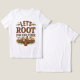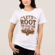 Feiern Sie Freundlichkeit und Gemeinschaft mit diesem rustikalen T - Shirt-Design mit dem Text "LET'S ROOT FOR EACH ANDERE" in einem charmanten handgezeichnet Schriftart. Illustrierte Karotten, Zwiebeln und Kartoffeln sorgen für eine spielerische Touch, Set auf beigefarbenem Holzboden. Perfekt für die Verbreitung von Positivität und gesunden Vibes im Alltag!
