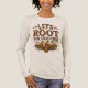 Feiern Sie Freundlichkeit und Gemeinschaft mit diesem rustikalen T - Shirt-Design mit dem Text "LET'S ROOT FOR EACH ANDERE" in einem charmanten handgezeichnet Schriftart. Illustrierte Karotten, Zwiebeln und Kartoffeln sorgen für eine spielerische Touch, Set auf beigefarbenem Holzboden. Perfekt für die Verbreitung von Positivität und gesunden Vibes im Alltag!