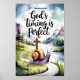 Eine Aquarellillustrierung einer Schnecke mit einem kleinen Kreuz auf ihrer Muschel. Die Schnecke bewegt sich auf einem kurvenreichen Weg. Über der Schnecke steht ein Text, in dem steht: "Die Zeit Gottes ist perfekt." Der Hintergrund ist eine ruhige Landschaft mit Bergen, Bäumen und einem Gewässer.