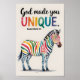 Une illustration aquarelle d'un zèbre avec des rayures colorées. Le zèbre est debout sur un fond uni. Au-dessus du zèbre, il y a le texte "Dieu Vous A Fait Unique.".
