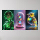 Ein Trio lebendiger, digitaler Render stellt futuristische Konzepte mit leuchtenden Elementen dar. Im links sieht eine farbenfrohe Zyborg mit leuchtend grünen Schaltmustern nach vorn, in der Mitte ist eine detaillierte Maschine mit Kugeln in einer Glaskuppel eingefasst, und rechts steht ein metallischer Vogel mit bunten Lichtern.