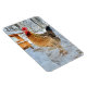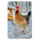 Dieser Magnet weist ein wunderschönes braunes Leghornhühnchen auf, das sich nach einem Schneesturm vor ihrem Zuhause posiert.