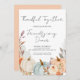 Cette citrouille boho automne Friendsgiving Diner invitation est parfait pour invitation vos amis et votre famille à un dîner de vacances. Le design présente de beaux citrouilles d'aquarelle en blanc, bleu et orange avec des fleurs de boho en terre cuite et ivoire avec de la verdure. Une police de script élégante est la touche finale parfaite. Personnalisez avec tous les détails pour votre dîner.