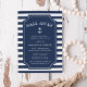 Les invitations à dîner à thème marin d'été en bleu et blanc de la marine classique présentent un arrière - plan rayé marine et blanc avec vos informations d'événement en blanc sur un élément central bleu marine, accentué par l'illustration de l'ancre d'un navire. Idéal pour des dîners de répétition sur yachts, voiliers ou dîners-croisière à la marina, club nautique ou lieux thématiques nautiques. Les invitations s'inversent à un motif de minuscules ancrages de marine.