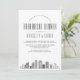 Un dîner de répétition unique invitation pour un mariage qui a lieu dans la belle ville de Houston, Texas. Cette invitation présente une illustration stylisée de l'horizon unique de la ville. Ensuite, vous recevrez des informations sur votre dîner de répétition dans un style ouvert assorti. À l'envers de l'invitation est une couleur gris-fusain profond pour compléter l'apparence et le toucher. De plus, il y a un endroit à l'envers pour vous d'ajouter des informations RSVP pour vos invités. Tous les éléments individuels de la carte invitation sont déverrouillés, alors n'hésitez pas à modifier ou ajouter les détails nécessaires en utilisant la fonction de personnalisation. Amusez-vous à être créatif et à en faire votre propre !
