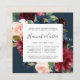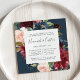 Notre invitation à dîner fleuri radiant dans un format carré unique encadre votre cérémonie de mariage et les détails du dîner avec des fleurs d'aquarelle peintes en rose rousse, marsala bordeaux et bleu marine, avec un feuillage d'eucalyptus vert contre un riche arrière - plan de la marine.