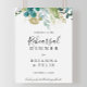 Ce panneau d'accueil de la répétition tropicale à fleurs dorées est parfait pour une répétition mariage moderne. Le design se compose principalement de feuillage vert aquarelle peint à la main et de fleurs dorées.