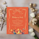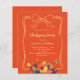 Un arrière - plan de couleur orange citrouille. Décoré de feuilles de chute et d'un arc dessiné à la main. Personnalisez et ajoutez les détails de la fête. 1 feuille = 1 invite imprimé bord à bord.