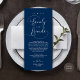 Appréciez la touche de finition parfaite de votre réception de mariage - notre élégant script romantique en Merci bleu marine Mariage Diner Lieu Fixation Cartes, avec titre de carte "à notre famille et à nos amis"! Conçues pour express votre appréciation sincère de la présence de chaque invité lors de votre journée spéciale, ces cartes sont le moyen idéal d'ajouter une touche personnelle à vos tables de dîner. Ces cartes de réglage de place sont faciles à utiliser - il suffit d'en placer une sur chaque carte de dîner pour créer une belle et réfléchie présentation. Non seulement ils feront apprécier vos invités, mais ils ajouteront également une touche de sophistication à votre réception. Que vous planifiez un rassemblement intime ou une grande fête, nos Cartes de Parcours Mariages Merci sont le moyen parfait pour express votre gratitude et faire sentir votre chéri à vos invités. Commandez le vôtre aujourd'hui et ajoutez une touche spéciale à votre bonheur toujours après le dîner! Conçu par TeeshaDerrick.