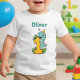 This personalized baby t-shirt features a cheerful, baby blue T-Rex wearing a party hat and embracing a large, bright yellow number "1", accented with tropical jungle leaves.