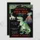 Une invitation à la fête du 1er anniversaire d'un dinosaure en dino-mite avec un T rex et brontosaurus, des feuilles de palmiers primitifs et un volcan en éruption. Scène de l'aube du temps, avec typographie colorée en rouge et vert sur un arrière - plan noir. Noir à l'arrière de l'invitation. Audacieux et amical. Chompe, estompe et graisse