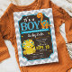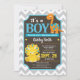 Das ist ein Junge! Blue, Orange und gelb Baby Dinosaurier Baby Dusche Einladung. Grauer und weißer Zickzack Musterhintergrund