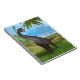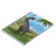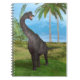 3D digitale Darstellung eines Dinosauriers Brachiosaurus auf dem Hintergrund des blauen Himmels und der grünen Palmen