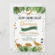 Diese bezaubernde Geburtstagseinladung beinhaltet tropische Aquarellfarben-Blätter mit Goldfolienschmuck und Golddinosaurier-Silhouetten.