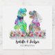 Fantastische Dinosaurier Braut und Bräutigam in einer farbenfrohen Wildblume Wiese eine Dinosaurier Thema Hochzeit Sekt, um Ihre Gäste zu erfreuen. Einfach mit den Namen der Braut und der Bräuche und dem Hochzeitstermin in modernen Typografie-Skripten anpassen. Funny Tyrannosaurus Rex Braut und Bräutigam und Aquarellfarben Sommer Blumenbilder in lila blau rosa grün gelb und orange Farben. Einzigartiges original Dino- und sommerliches Blumenwerk der Künstlerin Catherine Sweetman